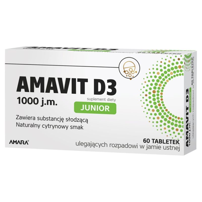 OpisAmavit D3 Junior 1000 j.m. to preparat uzupełniający dietę w witaminę D3, dostępny w formie tabletek rozpadających się w ustach. Został opracowany z myślą o dzieciach powyżej trzeciego roku życia. Ma przyjemny cytrynowy smak.