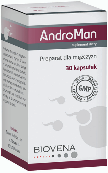 OpisAndroman to suplement diety przeznaczony dla dorosłych mężczyzn, którego składniki wspierają płodność.