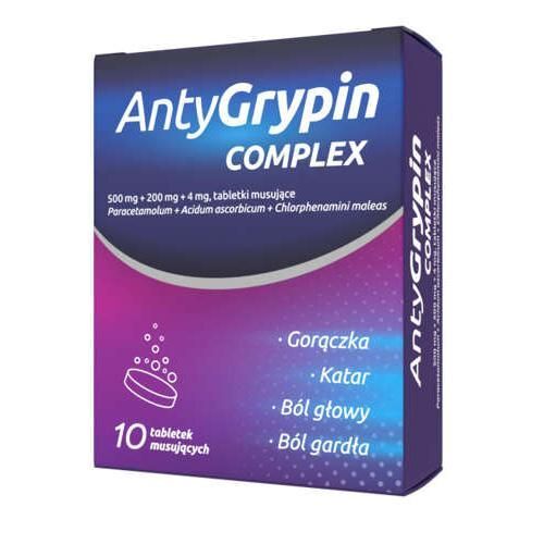 OpisAntyGrypin COMPLEX to lek z艂o偶ony, kt贸ry zawiera trzy substancje czynne: paracetamol, dzia艂aj膮cy przeciwb贸lowo i przeciwgor膮czkowo; chlorofenamina maleinian, kt贸ry zmniejsza wyciek wydzieliny 艣luzowej z nosa oraz 艂agodzi objawy takie jak kichanie i 艂zawienie oczu; oraz kwas askorbowy, kt贸ry uzupe艂nia niedobory witaminy C w organizmie.