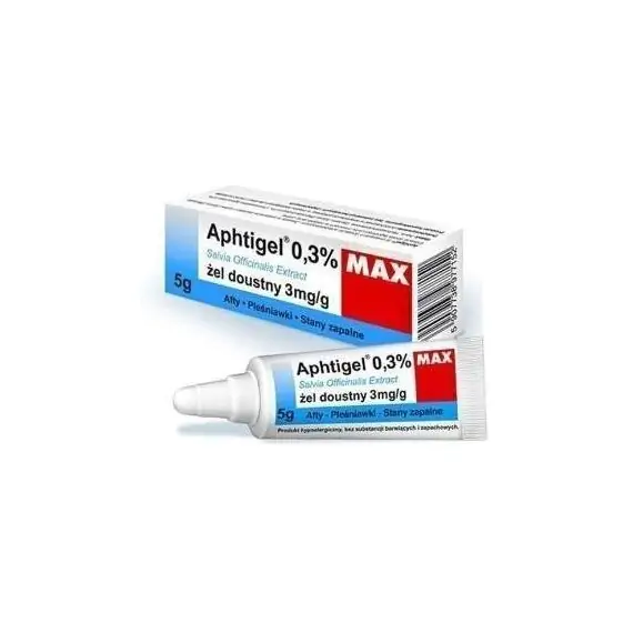 Aphtigel to lek w postaci 偶elu doustnego, kt贸ry ma dzia艂anie antybakteryjne. Zawiera ekstrakt z sza艂wii, kt贸ry dzia艂a 艂agodz膮co na zmiany w jamie ustnej.