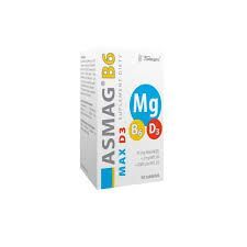 OpisAsmag B6 Max D3 to suplement diety przeznaczony dla os贸b doros艂ych, kt贸ry zawiera magnez, witamin臋 B6 i witamin臋 D.