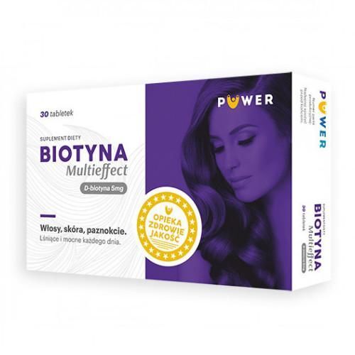 Puwer Biotyna Multieffect to suplement diety zawieraj膮cy biotyn臋. Opakowanie obejmuje 30 tabletek, co pozwala na miesi臋czn膮 kuracj臋. Zalecana dawka to jedna tabletka dziennie. Biotyna wspiera zdrowie w艂os贸w i sk贸ry.