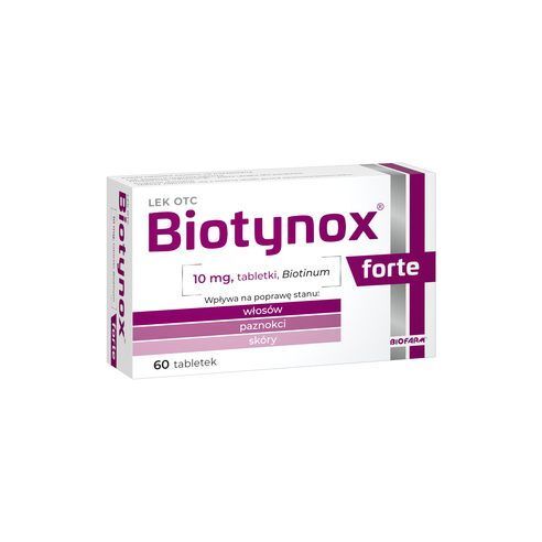 Dzia艂anieBiotynox Forte zawiera biotyn臋, kt贸ra jest witamin膮 z grupy B, rozpuszczaln膮 w wodzie. Biotyna wspomaga procesy powstawania keratyny i r贸偶nicowania si臋 kom贸rek nask贸rka oraz w艂os贸w i paznokci, poprawiaj膮c ich stan.