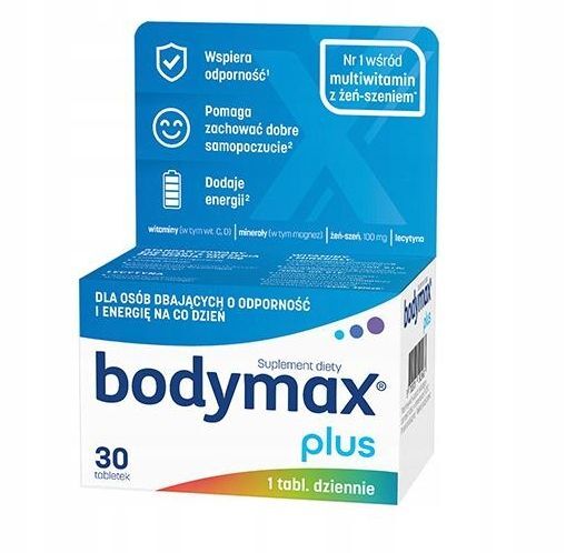 OpisBodymax Plus to suplement diety w formie tabletek, zawieraj膮cy standaryzowany ekstrakt z 偶e艅-szenia oraz kompleks 12 witamin i 6 minera艂贸w. Dodatkowo wzbogacony o lecytyn臋 z nasion soi, wspiera organizm w codziennym funkcjonowaniu.