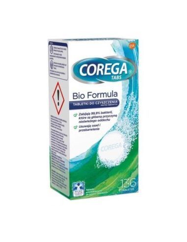 Corega Tabs Bio Formula do czyszczenia protez z臋bowych eliminuj膮 99,9% bakterii odpowiedzialnych za nie艣wie偶y oddech, usuwaj膮 osad i przebarwienia. Produkt od艣wie偶a protezy i czy艣ci je bez ryzyka zarysowa艅. Dzia艂a przeciwbakteryjnie, zapobiegaj膮c powstawaniu p艂ytki naz臋bnej i kamienia oraz zwi膮zanych z tym podra偶nie艅 dzi膮se艂. System czyszcz膮cy 4w1, z艂o偶ony z czterech aktywnych sk艂adnik贸w, skutecznie utrzymuje protezy w czysto艣ci, docieraj膮c nawet do trudno dost臋pnych miejsc.