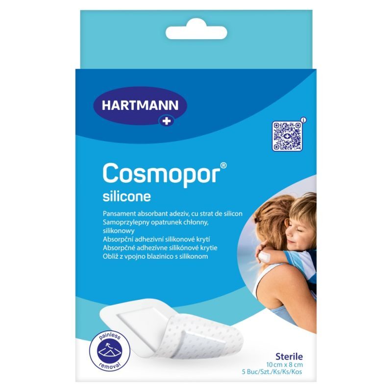 OpisCosmopor Silicone to opatrunek samoprzylepny, który absorbuje wydzieliny z ran, mając jednocześnie warstwę kontaktową z silikonem. Jest idealny do opatrywania ran pooperacyjnych i większych skaleczeń. Może być stosowany również po zabiegach dezynfekcji lub oczyszczania ran.