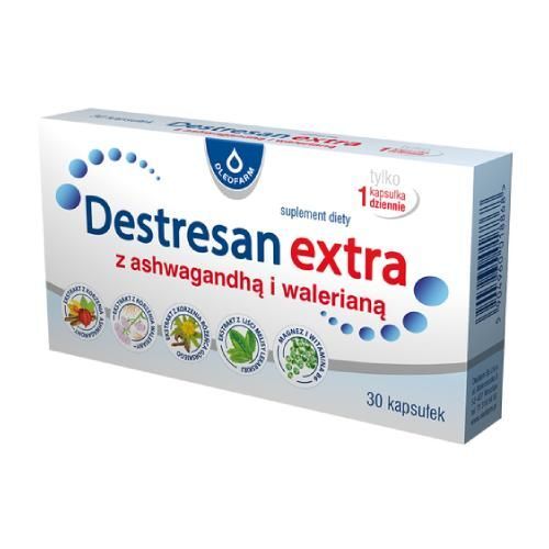 OpisDestresan Extra z Ashwagandhą to suplement diety w kapsułkach, który łączy ekstrakty z korzenia ashwagandhy, melisy lekarskiej oraz różeńca górskiego, a także magnez i witaminę B6. Zawarte składniki wspomagają prawidłowe funkcjonowanie układu nerwowego. Preparat dedykowany jest osobom dorosłym.