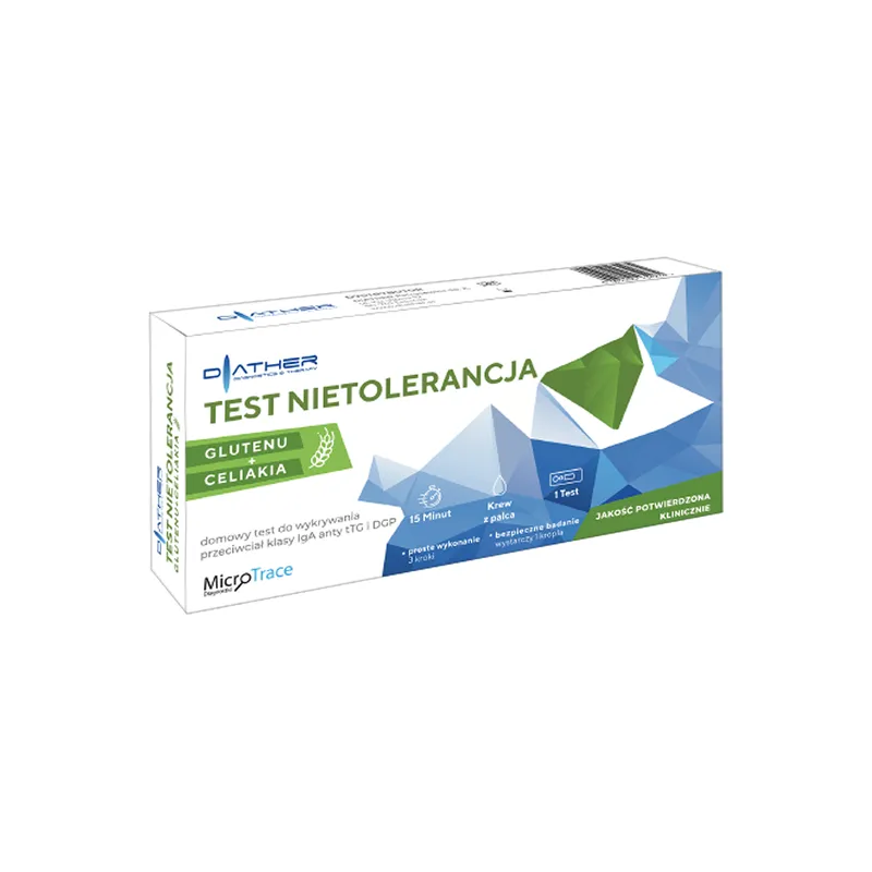 OpisDiather Test Nietolerancja umo偶liwia wykrycie we krwi i surowicy przeciwcia艂 klasy IgA przeciwko transglutaminazie tkankowej (tTG) i gliadynom (DGP). Jest przeznaczony do identyfikacji obecno艣ci glutenu we krwi w przypadku pojawienia si臋 niepokoj膮cych objaw贸w lub jako kontrola przy zdiagnozowanej celiakii. Test jest prosty w u偶yciu, wymaga jedynie pr贸bki krwi z palca, a wyniki s膮 dost臋pne ju偶 po 15 minutach.