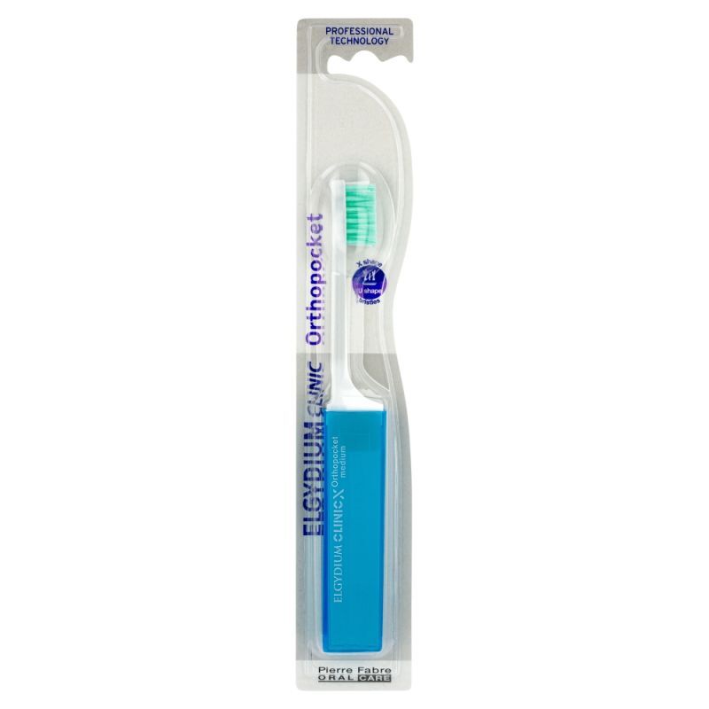 OpisElgydium Clinic Orthopocket to podróżna szczoteczka ortodontyczna, stworzona specjalnie dla osób noszących aparaty ortodontyczne, która jest również wygodna do zabrania w podróż.
