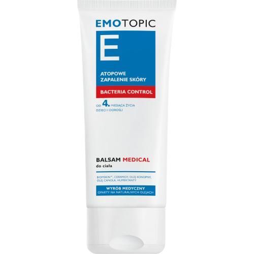 W艂a艣ciwo艣ciWyr贸b medyczny Emotopic Bacteria Control, balsam do cia艂a Medical stosowany jest do 艂agodzenia zmian sk贸rnych w przebiegu AZS. Mo偶e by膰 u偶ywany przez doros艂ych, m艂odzie偶, a tak偶e u dzieci od 4 miesi膮ca 偶ycia. Balsam jest hypoalergiczny, pozbawiony kompozycji zapachowej i nie zawiera glikokortykosteroid贸w.
