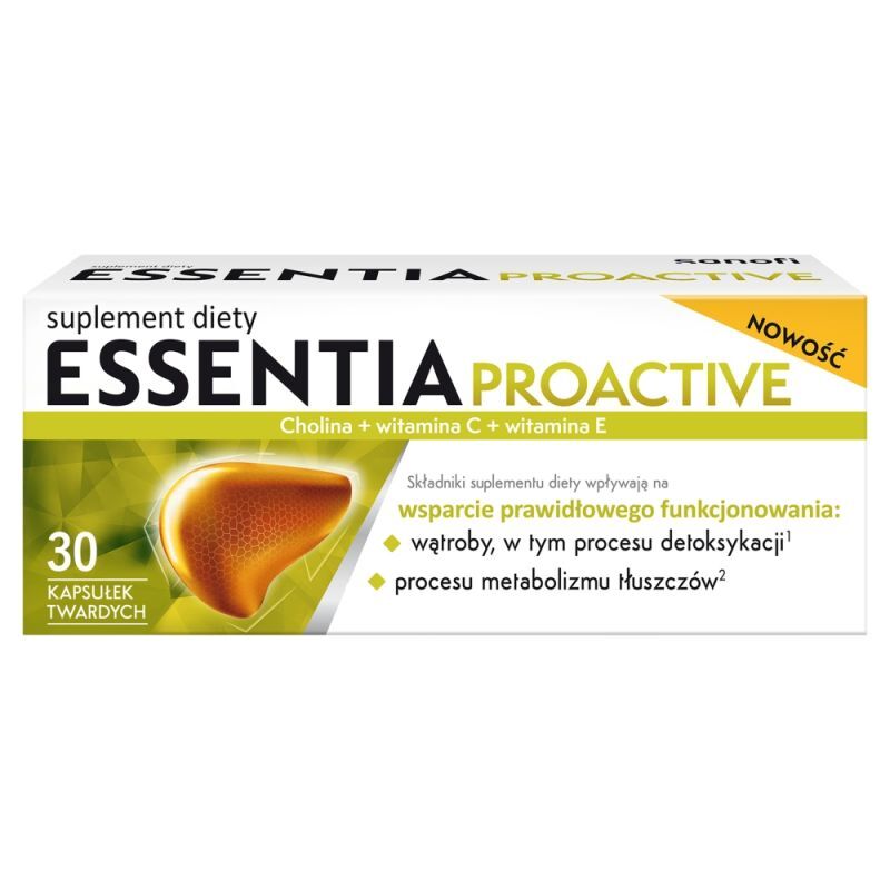 OpisEssentia Proactive to suplement diety w kapsułkach, który zawiera cholinę, witaminę E oraz witaminę C. Przeznaczony dla dorosłych, bez glutenu i laktozy, odpowiedni zarówno dla wegetarian, jak i wegan.