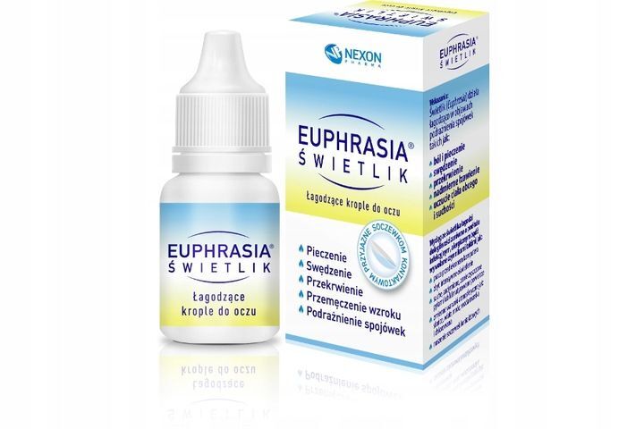 OpisEuphrasia 艢wietlik to krople do oczu b臋d膮ce wyrobem medycznym, kt贸re 艂agodz膮 podra偶nienia spoj贸wki i zm臋czenie oczu.