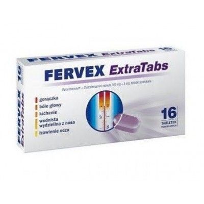 OpisFervex ExtraTabs to wielosk艂adnikowy lek przeznaczony do 艂agodzenia typowych objaw贸w przezi臋bienia i grypy, takich jak podwy偶szona temperatura, b贸le g艂owy, wodnisty katar, kichanie czy 艂zawienie oczu. Zawiera dwie substancje czynne, kt贸re wsp贸艂dzia艂aj膮, skutecznie redukuj膮c uci膮偶liwe symptomy infekcji.