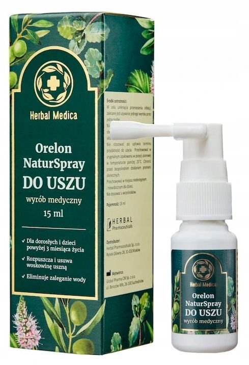 OpisHerbal Medica Orelon NaturSpray do Uszu to medyczny preparat w formie sprayu, stworzony na bazie oliwy z oliwek z dodatkiem olejku mi臋towego. Jego bezpieczna i efektywna formu艂a, oparta na dw贸ch naturalnych sk艂adnikach, wspiera codzienn膮 higien臋 uszu oraz pomaga zapobiega膰 gromadzeniu si臋 wody w przewodzie s艂uchowym. Produkt mo偶e by膰 stosowany zar贸wno przez doros艂ych, jak i przez dzieci oraz niemowl臋ta od 3. miesi膮ca 偶ycia.