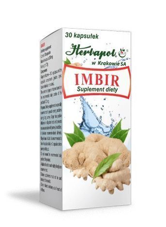 Herbapol Kraków zawierający imbir, przeznaczony na dolegliwości przewodu pokarmowego oraz problemy związane z chorobą lokomocyjną.