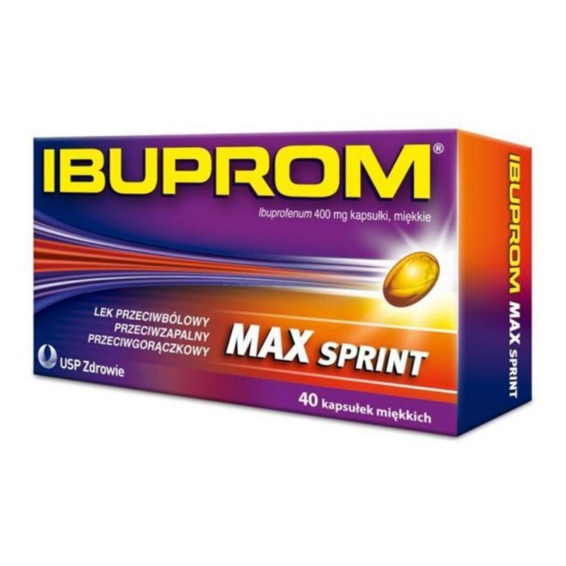 OpisIbuprom Max Sprint to lek w miękkich kapsułkach zawierający ibuprofen, niesteroidowy lek przeciwzapalny (NLPZ). Stosowany na bóle różnego pochodzenia od słabych do umiarkowanych: bóle głowy (np. napięciowy ból głowy), migrena z aurą lub bez aury (objawy: ból głowy, nudności, nadwrażliwość na światło i dźwięk), bóle zębów, nerwobóle, bóle mięśniowe, kostne i stawowe. Można go stosować także na bóle menstruacyjne oraz gorączkę, np. w przeziębieniu czy grypie. Przeznaczony dla dorosłych i młodzieży powyżej 12 lat.