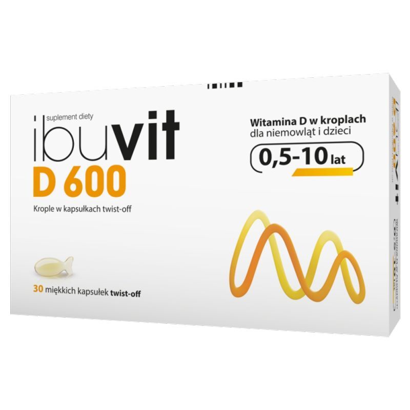 OpisIbuvit D 600 to suplement diety w postaci kapsu艂ek twist-off przeznaczony dla niemowl膮t powy偶ej 6. miesi膮ca 偶ycia oraz starszych dzieci. Ka偶da kapsu艂ka zawiera 15 碌g witaminy D (600 j.m.) rozpuszczalnej w t艂uszczach. Wype艂nienie kapsu艂ki stanowi olej kokosowy i palmowy.