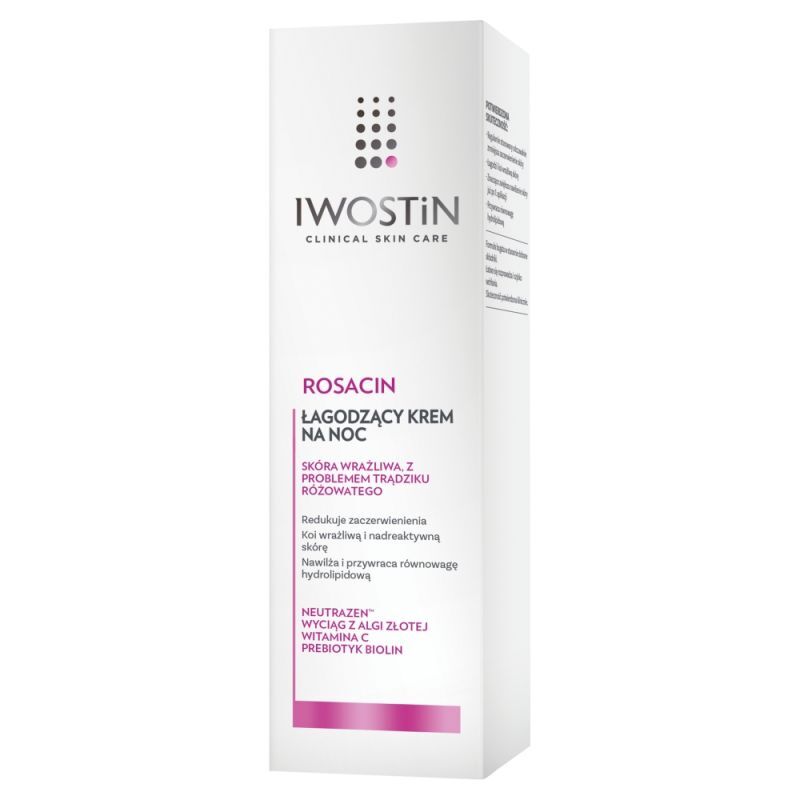 OpisIwostin Rosacin to krem na noc, który zmniejsza rumień w trądziku różowatym.