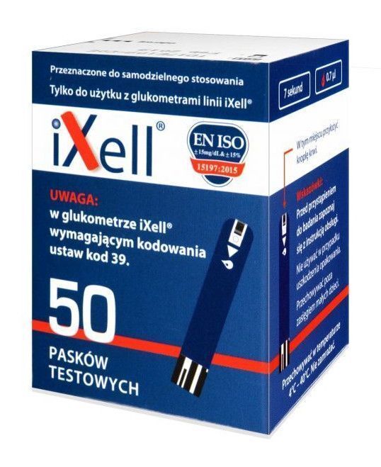 OpisiXell to paski testowe do glukometru, kt贸re s膮 wyrobem medycznym. Produkt umo偶liwia uzyskanie wyniku przy pr贸bce krwi o obj臋to艣ci 0,7 渭l. Uwaga: paski s膮 kompatybilne wy艂膮cznie z glukometrami z linii iXell.