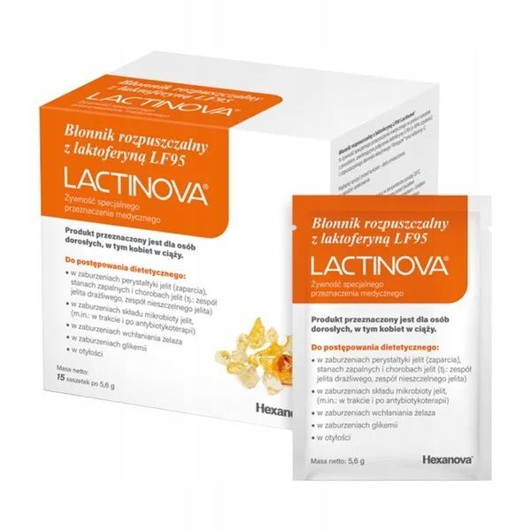 Lactinova Błonnik Rozpuszczalny z Laktoferyną LF95 to produkt żywnościowy o specjalnym przeznaczeniu medycznym, wspierający dietetyczne postępowanie w zaburzeniach pracy jelit.