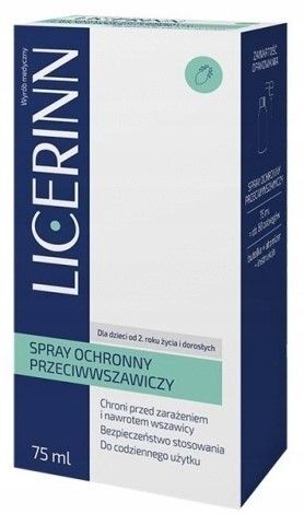 LICERINN Spray ochronny przeciwwszawiczy s艂u偶y do codziennego stosowania w celu zwi臋kszenia ochrony przed zara偶eniem si臋 wszawic膮. Produkt mo偶e by膰 stosowany r贸wnie偶 na ubrania jako element prewencyjny.