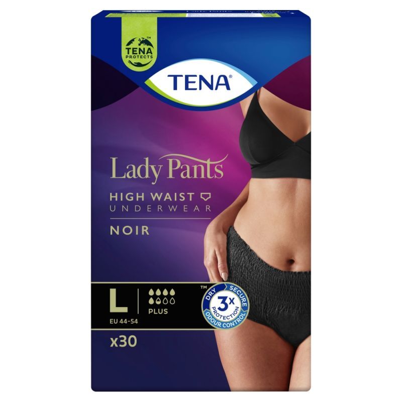 TENA Lady Pants Plus Noir to ch艂onna bielizna dla kobiet. Wysokostanowy model w kolorze czarnym dobrze dopasowuje si臋 do cia艂a, oferuj膮c dyskretn膮 ochron臋 przed nietrzymaniem moczu.