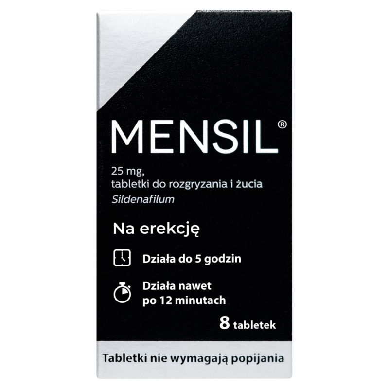 DawkowanieZalecana dawka leku Mensil to 25 mg, czyli 1 tabletka, kt贸r膮 nale偶y rozgry藕膰 lub 偶u膰 na oko艂o godzin臋 przed planowan膮 aktywno艣ci膮 seksualn膮.. Lekarz po konsultacji mo偶e zaleci膰 inny spos贸b dawkowania. Leku nie nale偶y stosowa膰 cz臋艣ciej ni偶 raz na dob臋 i nie wymaga on popijania.