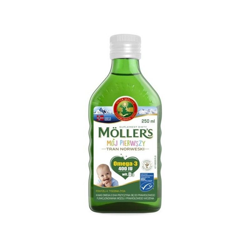 Mój Pierwszy Tran Norweski od Moller's to płynny preparat zawierający olej z wątroby dorsza. Specjalna formuła w postaci płynnej sprawia, że jest on odpowiedni do stosowania u niemowląt, które ukończyły 4 tygodnie życia.
