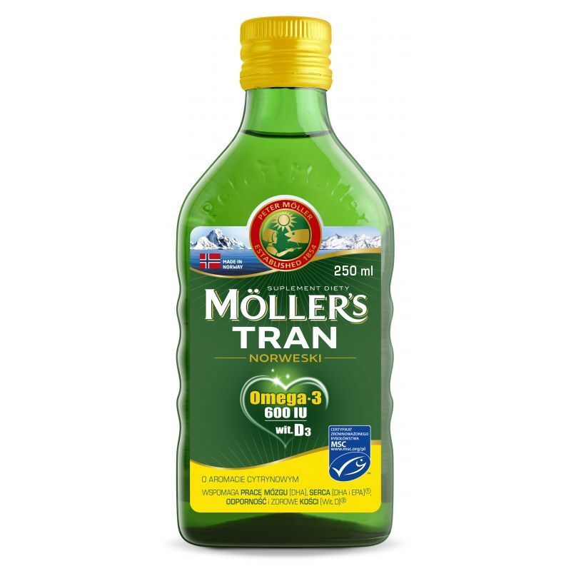 OpisMoller's Tran Norweski o smaku cytrynowym to suplement diety w p艂ynie, przeznaczony zar贸wno dla dzieci od 3 roku 偶ycia, jak i dla doros艂ych. Zawiera wysokiej jako艣ci olej z w膮troby dorsza, b臋d膮cy naturalnym 藕r贸d艂em kwas贸w omega-3, a tak偶e witaminy A i D. Produktem wyr贸偶niaj膮cym si臋 jest tran pochodz膮cy z dorsza.