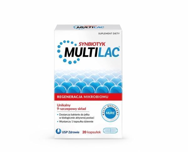 OpisMULTILAC to suplement diety, który łączy w sobie 9 szczepów bakterii, w tym Lactobacillus i Bifidobacterium, w ilości 4,5 miliarda w każdej kapsułce. Zawiera również fruktooligosacharydy (FOS). Preparat przeznaczony jest zarówno dla dorosłych, jak i dzieci, szczególnie w okresach jesienno-zimowych, podczas antybiotykoterapii oraz w sytuacjach zaburzeń naturalnej flory bakteryjnej.