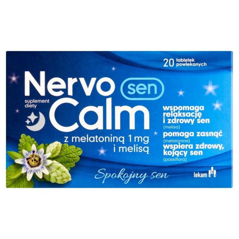 SkładnikiSubstancja wypełniająca - celuloza, ekstrakt z liści melisy lekarskiej (Melissa officinalis), ekstrakt z szyszek chmielu (Humulus lupulus), nośnik - sól sodowa karboksymetylocelulozy, substancja przeciwzbrylajqca - dwutlenek krzemu, ekstrakt z ziela męczennicy (Passiflora incarnata), substancja glazurująca - hydroksypropylometyloceluloza, substancja przeciwzbrylająca - sole magnezowe kwasów tłuszczowych, substancja wypetniajqca - polidekstroza, nośnik - glikol polietylenowy, barwnik - dwutlenek tytanu, substancja przeciwzbrylająca - talk, melatonina, nośnik -monooleinian polioksyetylenosorbitolu, barwniki - błękit brylantowy FCF, karminy.