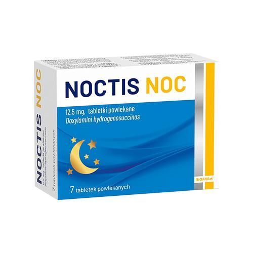 OpisNoctis Noc 12,5 mg to lek o dzia艂aniu uspokajaj膮cym, kt贸ry jest skuteczny w u艂atwianiu zasypiania. Ka偶da tabletka zawiera 12,5 mg doksylaminy, substancji nale偶膮cej do grupy lek贸w przeciwhistaminowych. Noctis Noc jest przeznaczony do kr贸tkotrwa艂ego, objawowego leczenia sporadycznej bezsenno艣ci u doros艂ych.