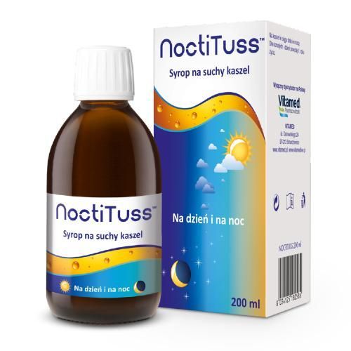 OpisNoctituss to syrop na suchy kaszel, stworzony na bazie naturalnych sk艂adnik贸w o udokumentowanym dzia艂aniu. Przeznaczony jest do u偶ytku zar贸wno u dzieci od 1. roku 偶ycia, jak i u doros艂ych. Produkt 艂agodzi objawy suchego, dra偶ni膮cego kaszlu, wyst臋puj膮cego zar贸wno w ci膮gu dnia, jak i w nocy, oraz 艂agodzi podra偶nienia b艂ony 艣luzowej gard艂a. Syrop hamuje odruch kaszlowy i dzia艂a przeciwzapalnie. Opr贸cz sk艂adnik贸w pochodzenia naturalnego, takich jak mi贸d, ekstrakty ze 艣lazu dzikiego, prawo艣lazu lekarskiego i stulisza lekarskiego, zawiera r贸wnie偶 alginian magnezu, kt贸ry tworzy ochronn膮 barier臋 na powierzchni 艣luz贸wki. Dzi臋ki temu wzmacnia w艂a艣ciwo艣ci powlekaj膮ce i mukoadhezyjne syropu. Noctituss u艂atwia odkrztuszanie, nawil偶a b艂on臋 艣luzow膮 gard艂a i przynosi ulg臋 w kaszlu.