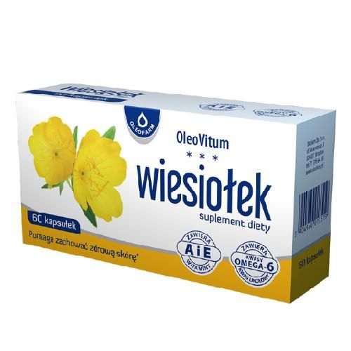 OpisOleoVitum Wiesio艂ek to suplement diety w formie kapsu艂ek, kt贸ry zawiera olej z nasion wiesio艂ka (Oenothera paradoxa) t艂oczony na zimno. Preparat wzbogacono o dwie istotne witaminy rozpuszczalne w t艂uszczach: A i E.
