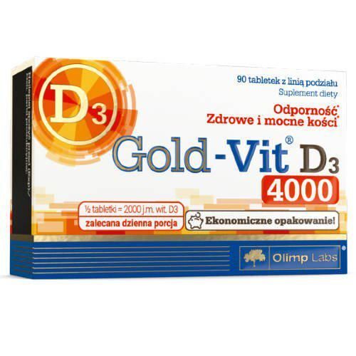 OpisGold-Vit D3 4000 j.m. firmy Olimp to suplement diety zawierający wysoką dawkę witaminy D, przeznaczony do stosowania przez osoby dorosłe, kobiety w ciąży i karmiące piersią, dzieci powyżej 11. roku życia, osoby w okresie menopauzy oraz osoby aktywne fizycznie i starsze. Witamina D wspiera zdrowie kości i zębów oraz pomaga utrzymać prawidłowy poziom wapnia we krwi. Dodatkowo, korzystnie wpływa na funkcjonowanie układu odpornościowego. Produkt dostępny jest w opakowaniu zawierającym 90 tabletek, z praktyczną podziałką ułatwiającą dzielenie tabletek na mniejsze dawki.
