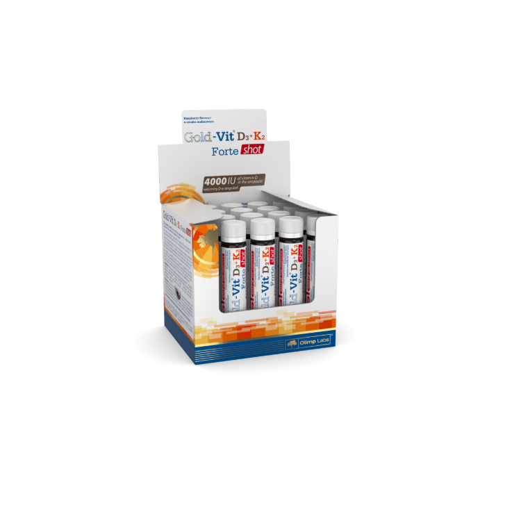 OpisGold-Vit D3+K2 Forte shot to płynny suplement diety o smaku malinowym. Zawiera wysoką dawkę witaminy D3 oraz witaminę K2 w postaci menachinonu-7, która jest najbardziej przyswajalną i biologicznie aktywną formą tej witaminy. Witamina D wspiera prawidłowe funkcjonowanie układu odpornościowego oraz pomaga w odpowiednim wchłanianiu wapnia i fosforu. Witamina K przyczynia się do właściwego procesu krzepnięcia krwi oraz, podobnie jak witamina D, wspomaga utrzymanie zdrowych kości.