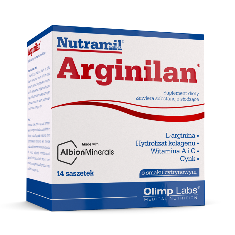 OpisOlimp Nutramil Complex Arginilan jako suplement diety dostępny w formie saszetek z cytrynowym proszkiem. Jego formuła łączy L-argininę z hydrolizatem kolagenu, witaminami A i C oraz cynkiem w postaci chelatu amerykańskiego Albion, wspomagając codzienną dietę dorosłych.