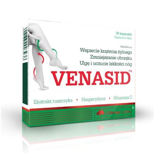 OpisVenasid to preparat przeznaczony dla dorosłych, będący suplementem diety, który zawiera ekstrakt z ruszczyka kolczastego, witaminę C oraz hesperydynę pozyskiwaną z owoców gorzkiej pomarańczy (Citrus aurantium L.).