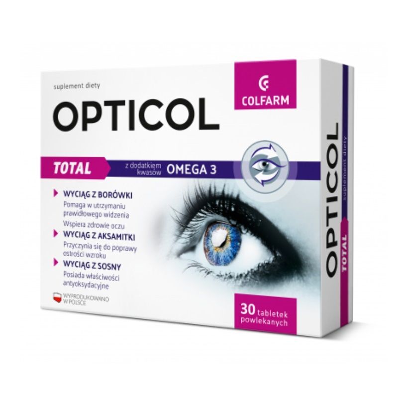 OpisOpticol Total Colfarm to kompleksowy suplement diety, 艂膮cz膮cy sk艂adniki ro艣linne, takie jak ekstrakt z bor贸wki, ekstrakt z aksamitki wzniesionej, ekstrakt z sosny nadmorskiej oraz olej rybi. Preparat jest wzbogacony o ryboflawin臋, witaminy C i E oraz minera艂y, w tym mied藕, cynk i selen.