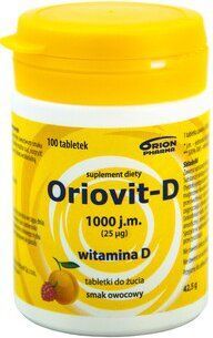 OpisOriovit-D 1000 j.m. suplement diety w postaci niewielkich tabletek do 偶ucia. Produkt przeznaczony dla dzieci powy偶ej 6 roku 偶ycia i os贸b doros艂ych.