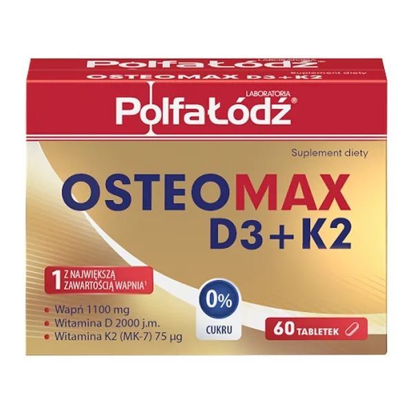 OpisOsteoMax D3+K2 to suplement diety dla doros艂ych, kt贸ry dostarcza organizmowi wap艅 oraz witaminy D i K, wspieraj膮ce zdrowie ko艣ci i prawid艂owe funkcjonowanie uk艂adu kostnego.