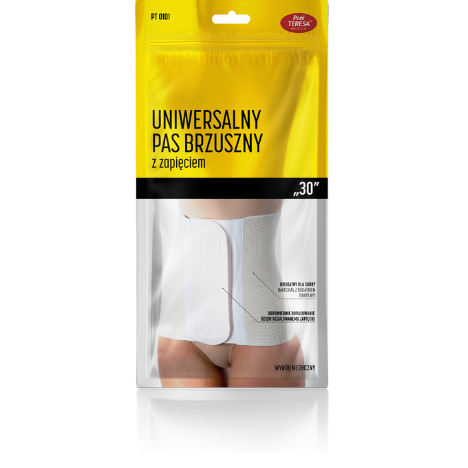 OpisPoporodowy pas brzuszny Pani Teresa ma przewiewną strukturę i 24 cm szerokości. Zakłada się go przez nogi. To wyrób medyczny wielokrotnego użytku opracowany dla kobiet po porodzie.