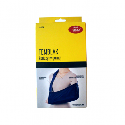 Sposób użyciaPrzedramię umieścić w kieszeni temblaka, kciuk zawiesić w przeznaczonym do tego „oczku” w wewnętrznej części temblaka. Taśmę przełożyć przez zdrowe ramię dopasowując odpowiednio jej długość za pomocą rzepów, a wzmocnienie ochronne na taśmie układając na szyi.