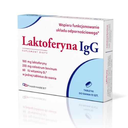 OpisLaktoferyna IgG to suplement diety dostępny w formie tabletek do ssania. Zawiera laktoferynę z mleka krowiego, siarę bydlęcą (Colostrum bovinum) oraz witaminę D w postaci cholekalcyferolu.