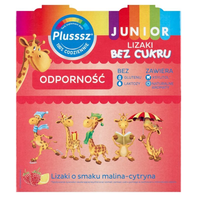 OpisPlusssz Junior Odporno艣膰, lizaki bez cukru, to suplement diety wspieraj膮cy odporno艣膰. Przeznaczony dla dzieci powy偶ej 3. roku 偶ycia oraz doros艂ych. Produkt nie zawiera cukru, laktozy ani glutenu, a w sk艂adzie ma ksylitol i izomalt. Dost臋pny w smaku malinowo-cytrynowym.