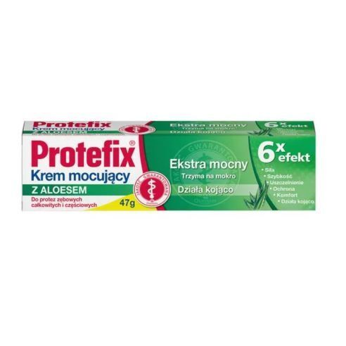 OpisProtefix krem mocujący z aloesem, ekstra mocny, 47 g, to wyrób medyczny przeznaczony do mocowania pełnych i częściowych protez zębowych. Dzięki zawartości wyciągu z aloesu wspomaga regenerację dziąseł.