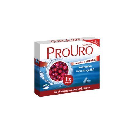 OpisProUro to suplement diety stworzony z myślą o kobietach. Produkt zawiera standaryzowany ekstrakt z owoców żurawiny wielkoowocowej (Vaccinium macrocarpon), bogaty w proantocyjanidy (PAC), oraz witaminę C. Żurawina, znana ze swojego dobroczynnego działania i właściwości odżywczych, posiada cenne proantocyjanidy (PAC), których ilość w jednej kapsułce ProUro wynosi 36 mg.