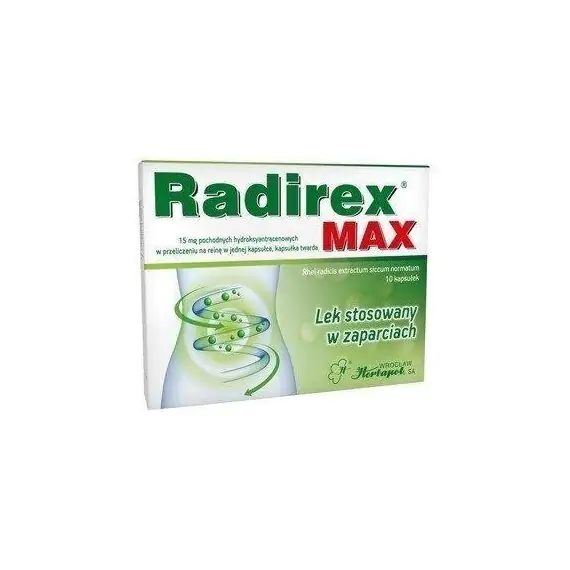 OpisRadirex MAX to produkt leczniczy o dzia艂aniu przeczyszczaj膮cym, przeznaczony do stosowania w przypadku sporadycznych zapar膰. Jego dzia艂anie opiera si臋 na obecno艣ci pochodnych antracenowych, takich jak reina, kt贸re wykazuj膮 dzia艂anie przeczyszczaj膮ce. Produktem tym mo偶na si臋 pos艂u偶y膰 w celu z艂agodzenia okresowych problem贸w z zaparciami.