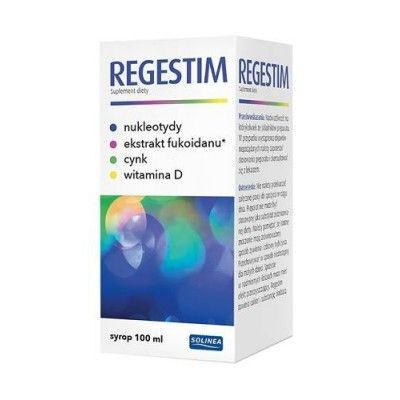 OpisRegestim to suplement diety w formie syropu, który zawiera kombinację składników takich jak witamina D, cynk, mieszanina nukleotydów pochodzących z drożdży Saccharomyces cerevisiae oraz fukodian z wodorostów Undaria pinnatifida. Preparat ten jest polecany do stosowania przez dorosłych oraz dzieci powyżej 3 roku życia, zwłaszcza w okresie jesienno-zimowym oraz podczas przesilenia.