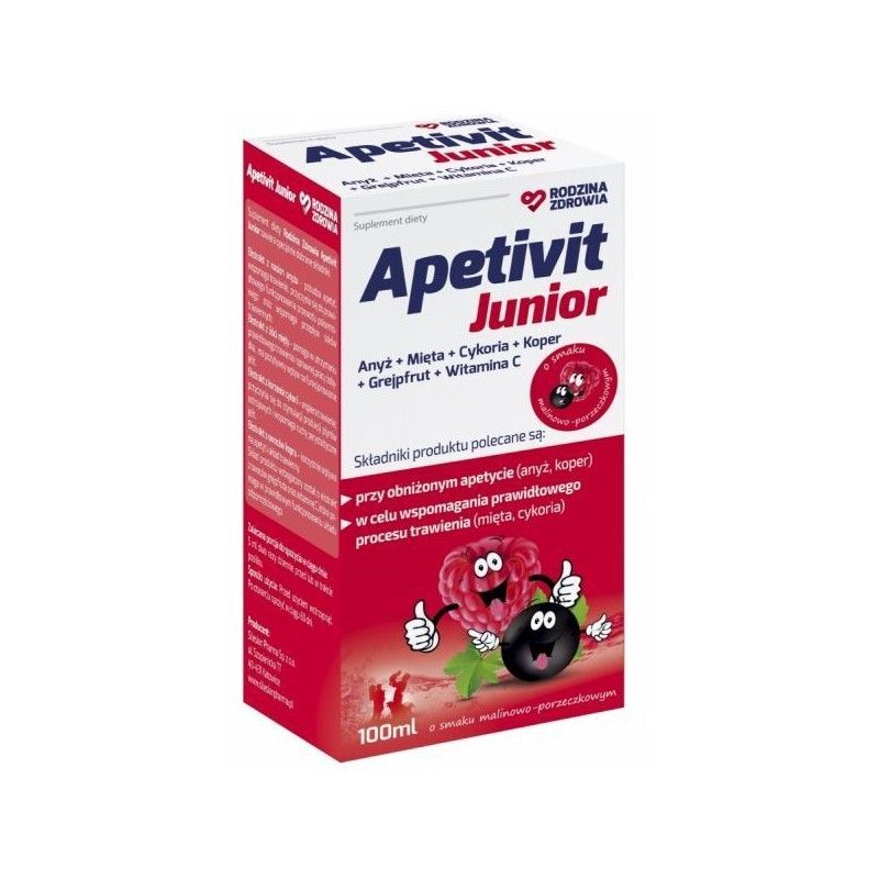 OpisRodzina Zdrowia Apetivit Junior o smaku malinowo-porzeczkowym pobudza apetyt, wspomaga trawienie, przyczynia się do prawidłowego funkcjonowania przewodu pokarmowego oraz wspomaga przepływ soków trawiennych.